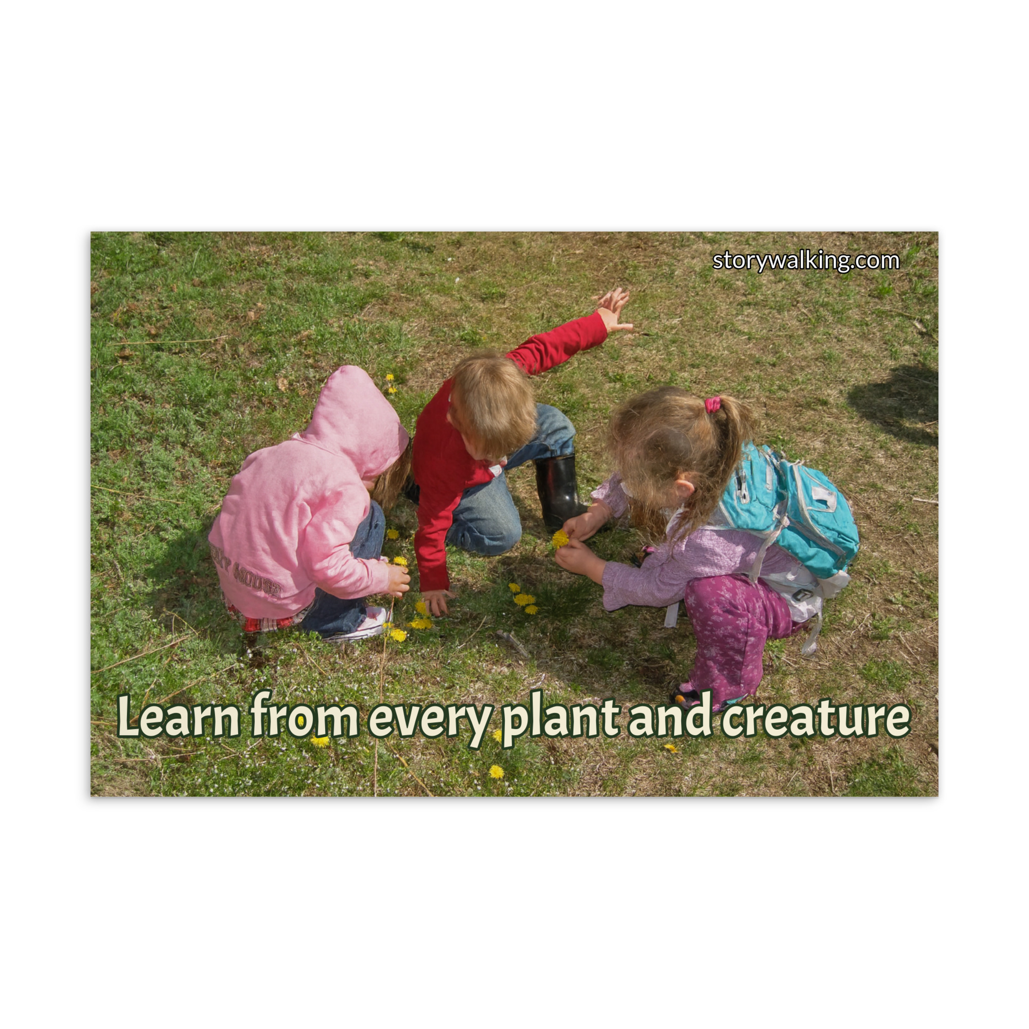This heartwarming postcard captures the innocence of children exploring nature, as they gather around a patch of dandelions. The inspiring message “Learn from every plant and creature” serves as a gentle reminder to embrace curiosity and the valuable lessons nature offers.