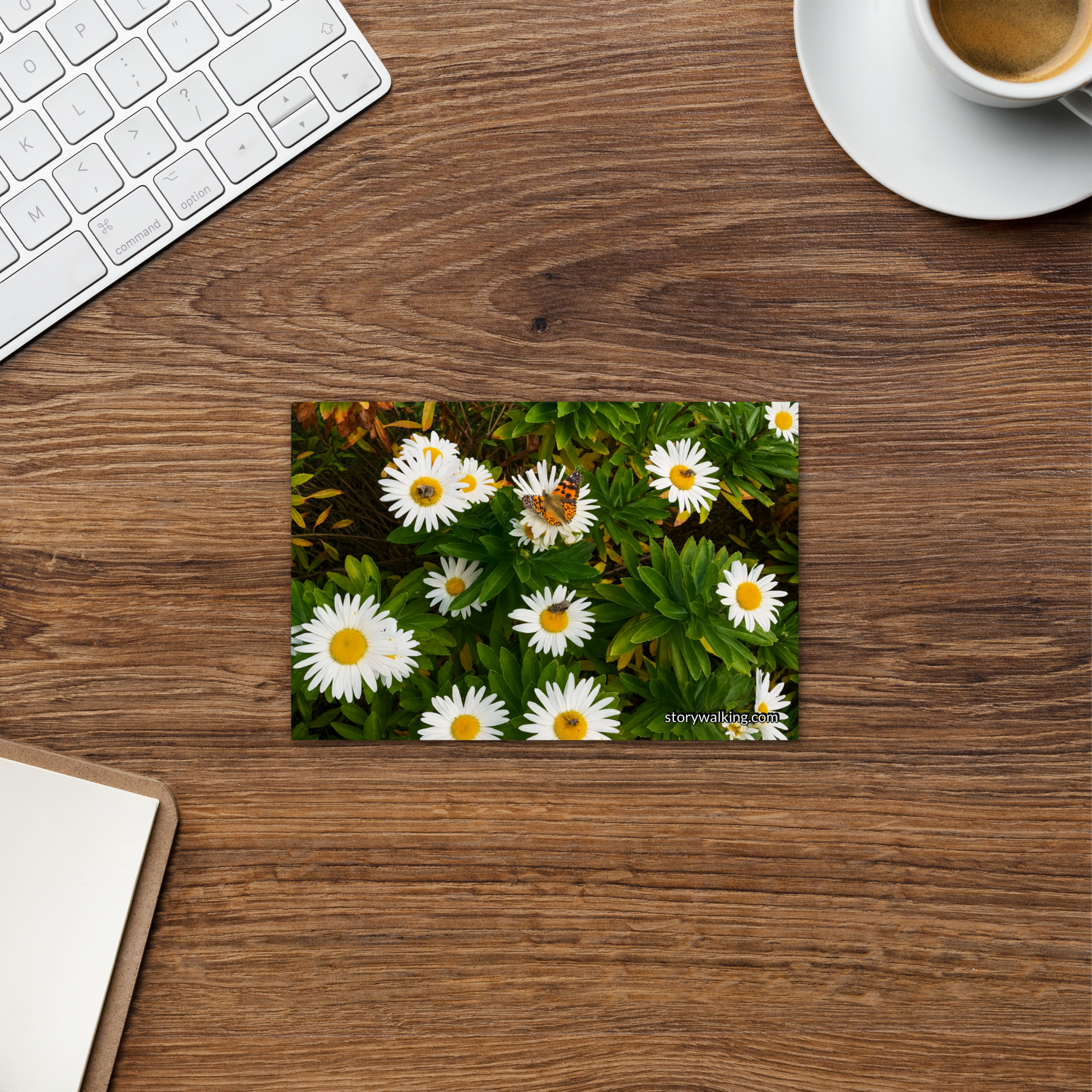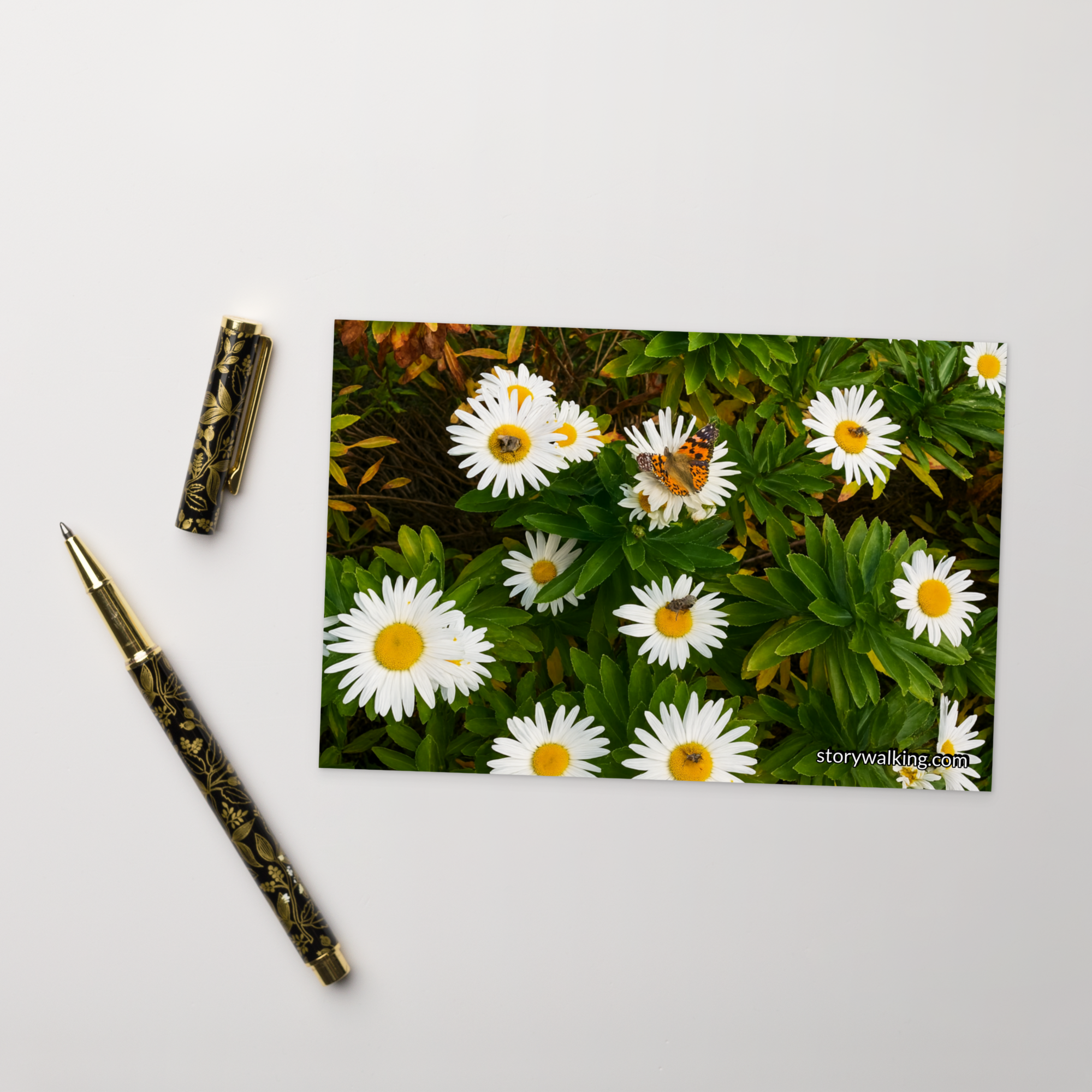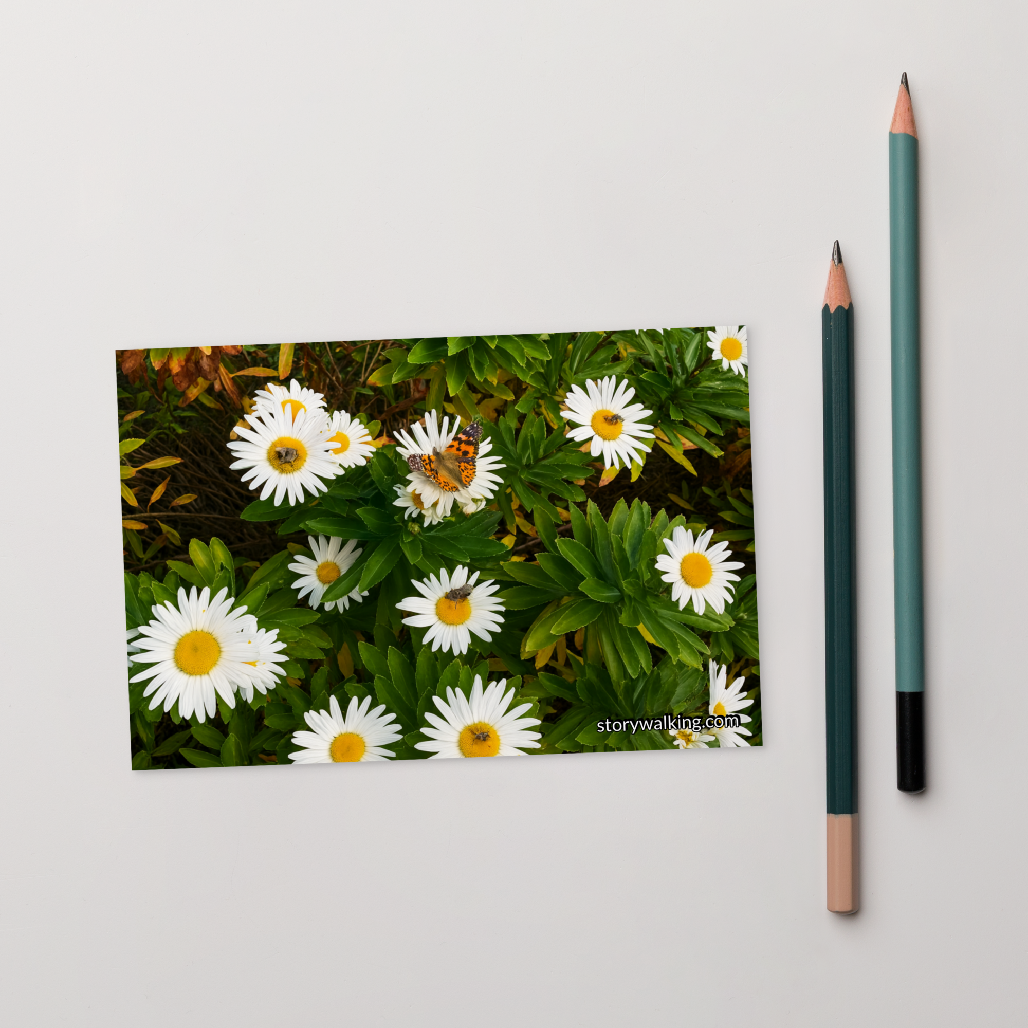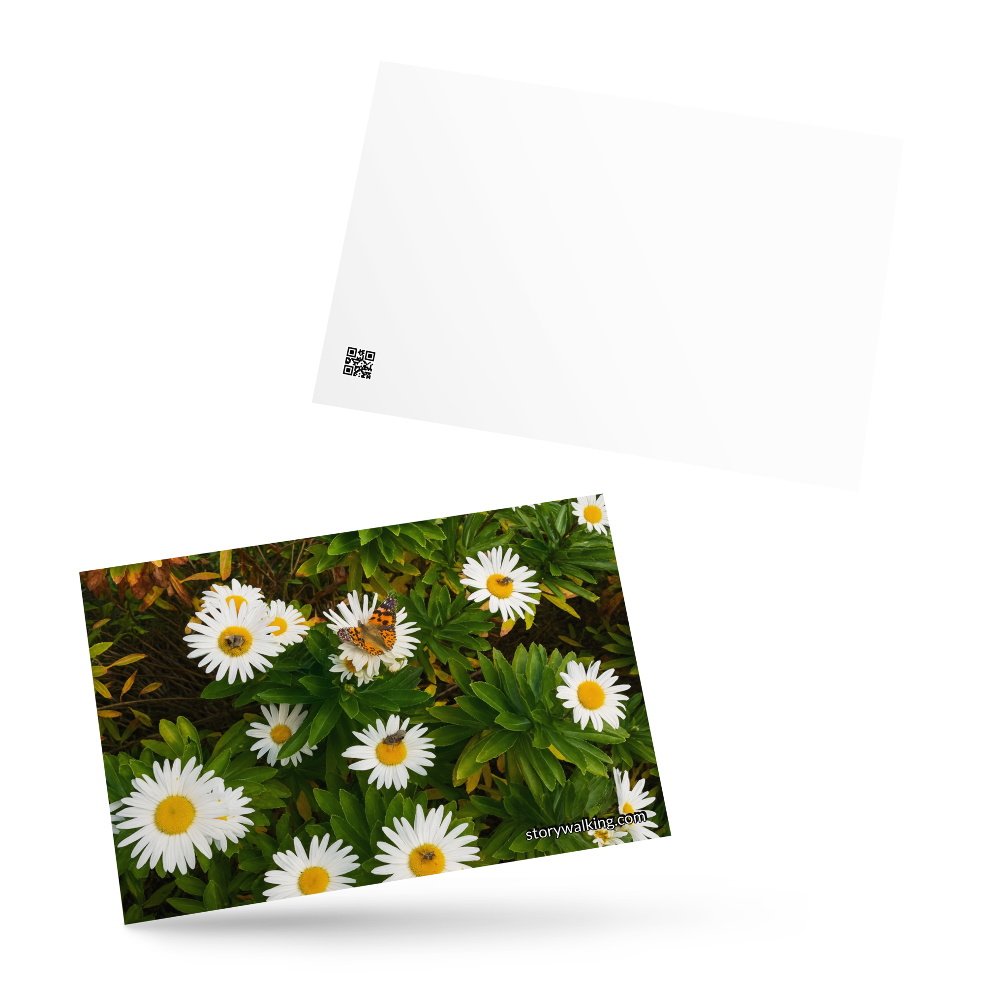 This beautiful postcard captures the serene essence of nature with a vibrant image of daisies, complete with a butterfly delicately resting among the petals. The fresh, natural beauty of the flowers evokes feelings of peace and connection with the natural world.