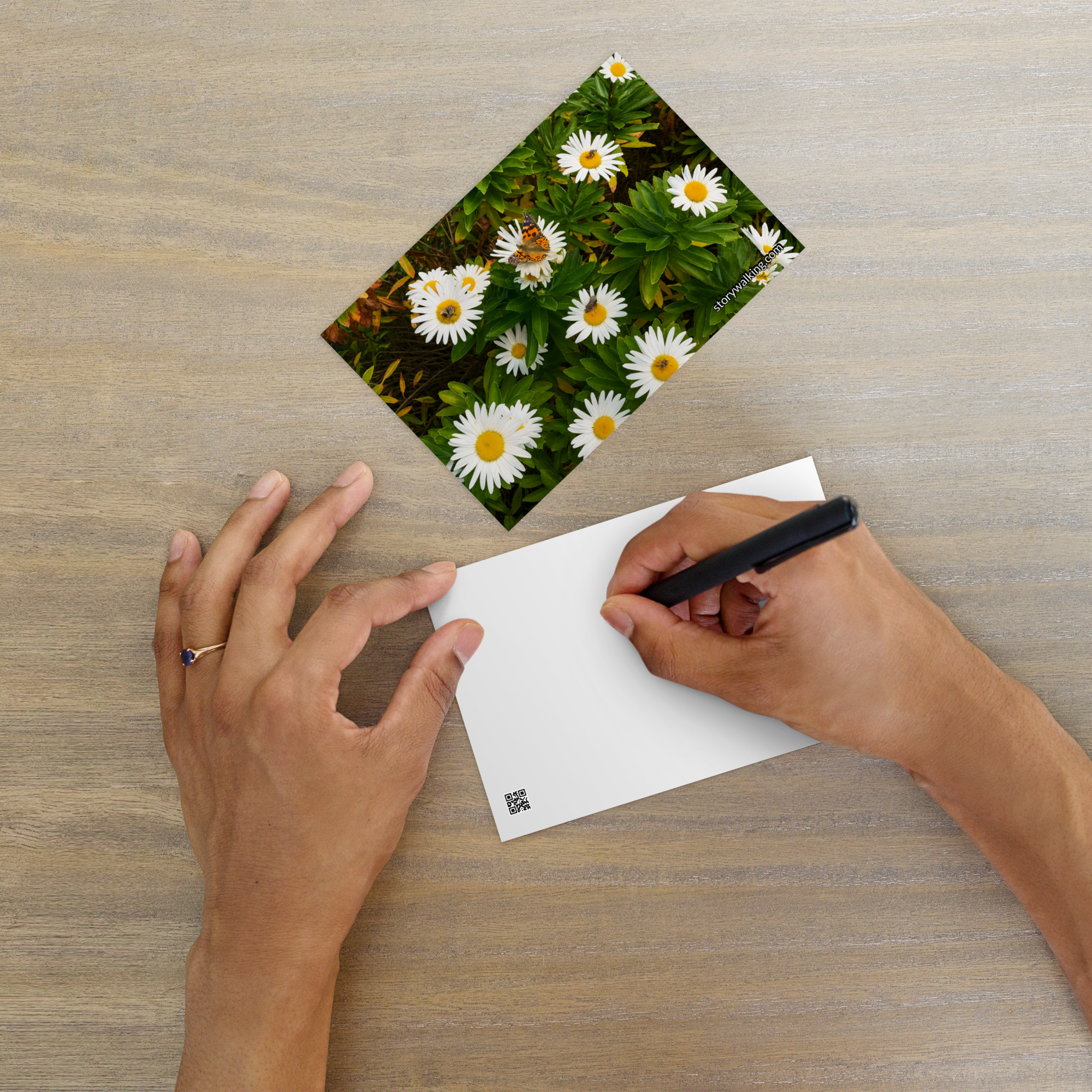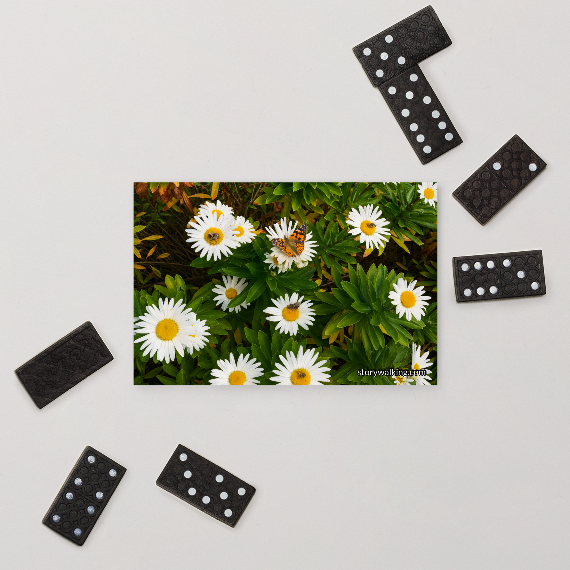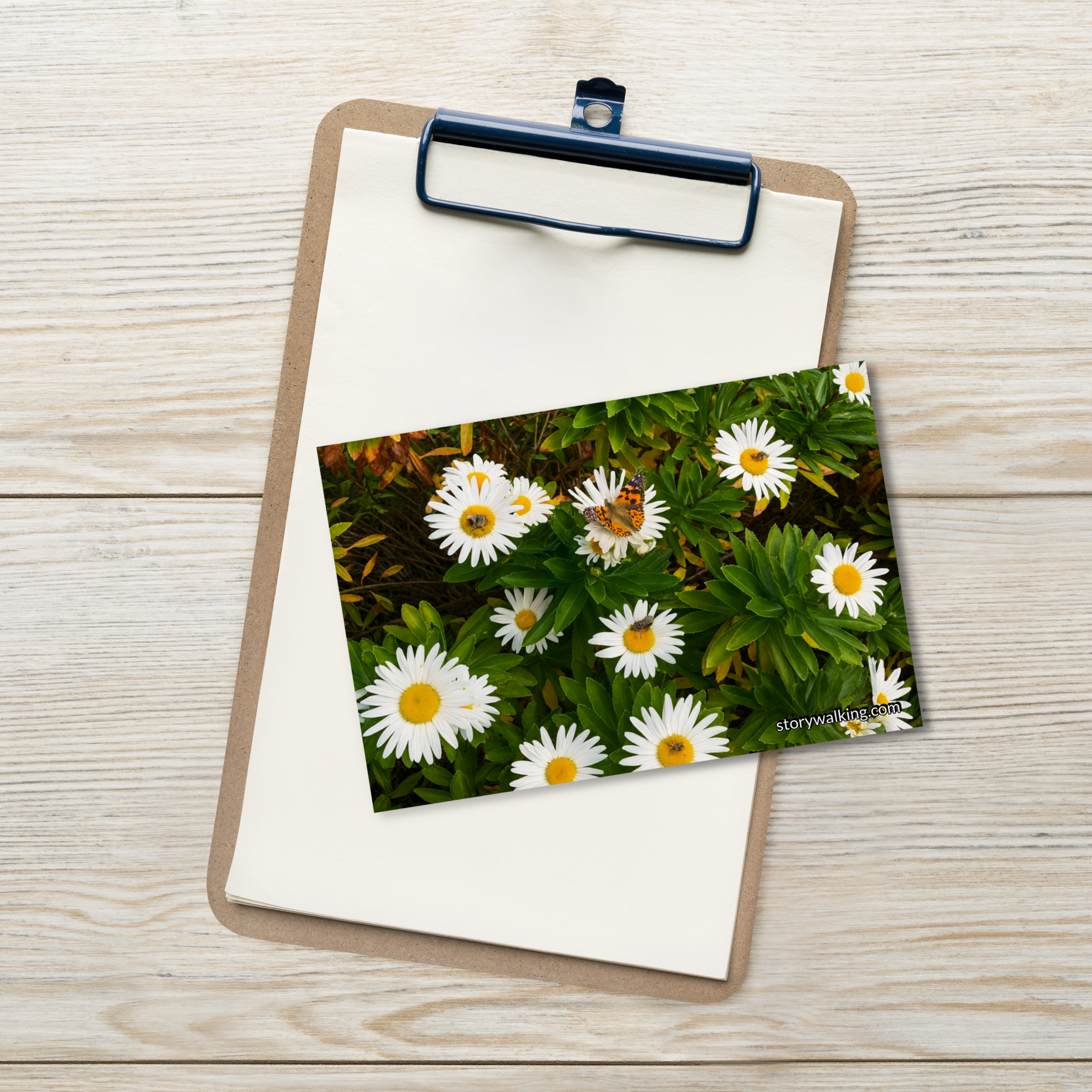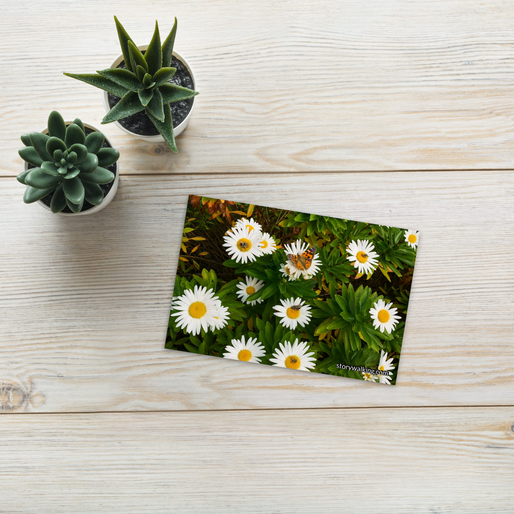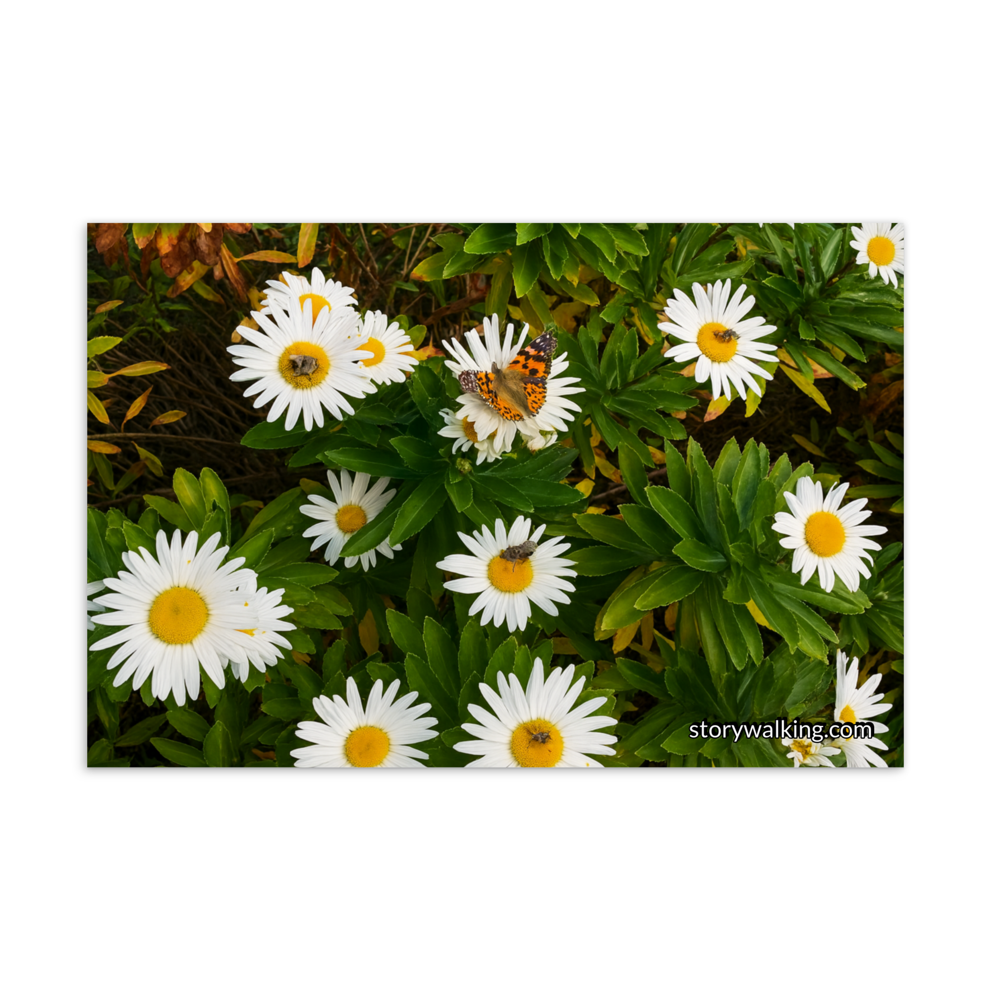 This beautiful postcard captures the serene essence of nature with a vibrant image of daisies, complete with a butterfly delicately resting among the petals. The fresh, natural beauty of the flowers evokes feelings of peace and connection with the natural world.