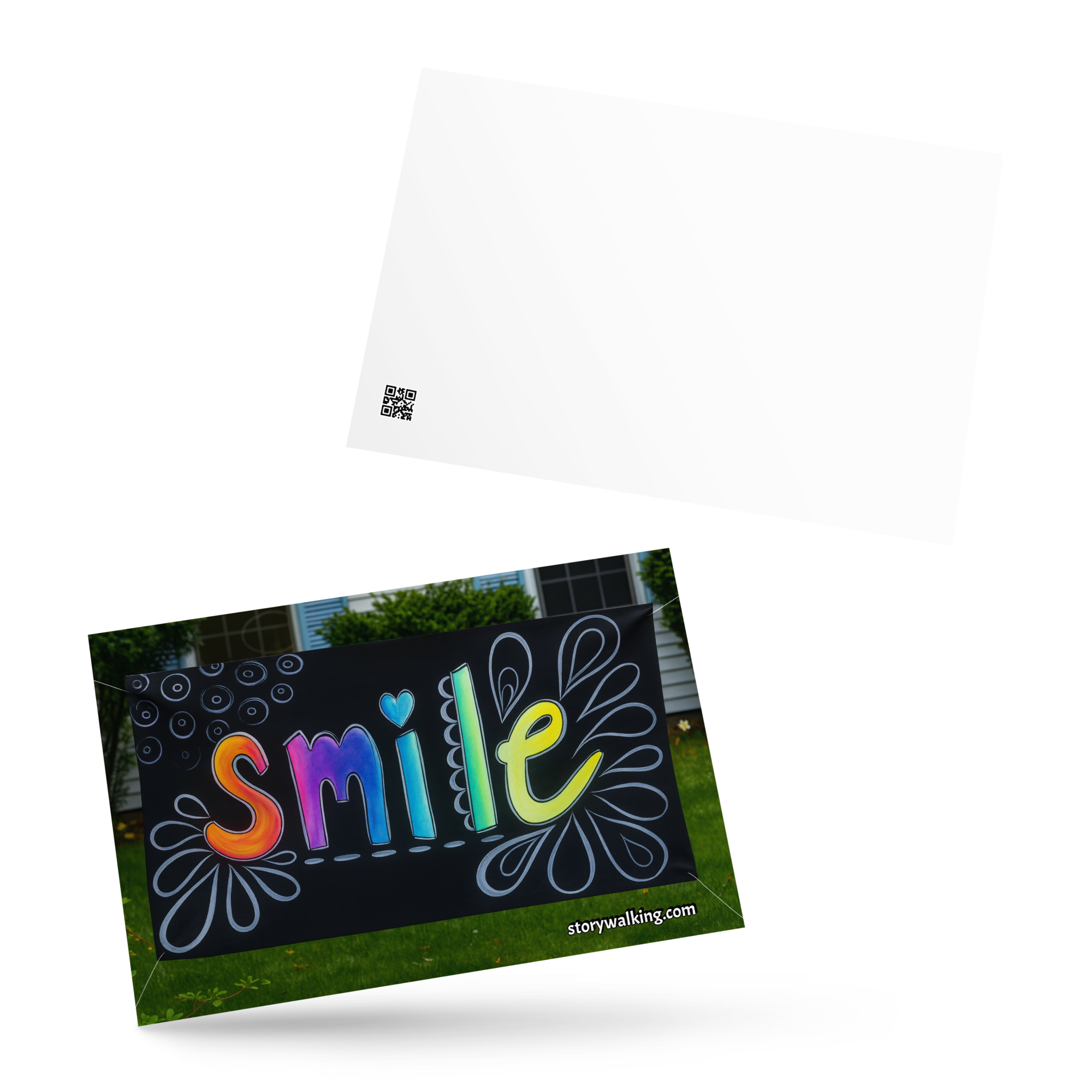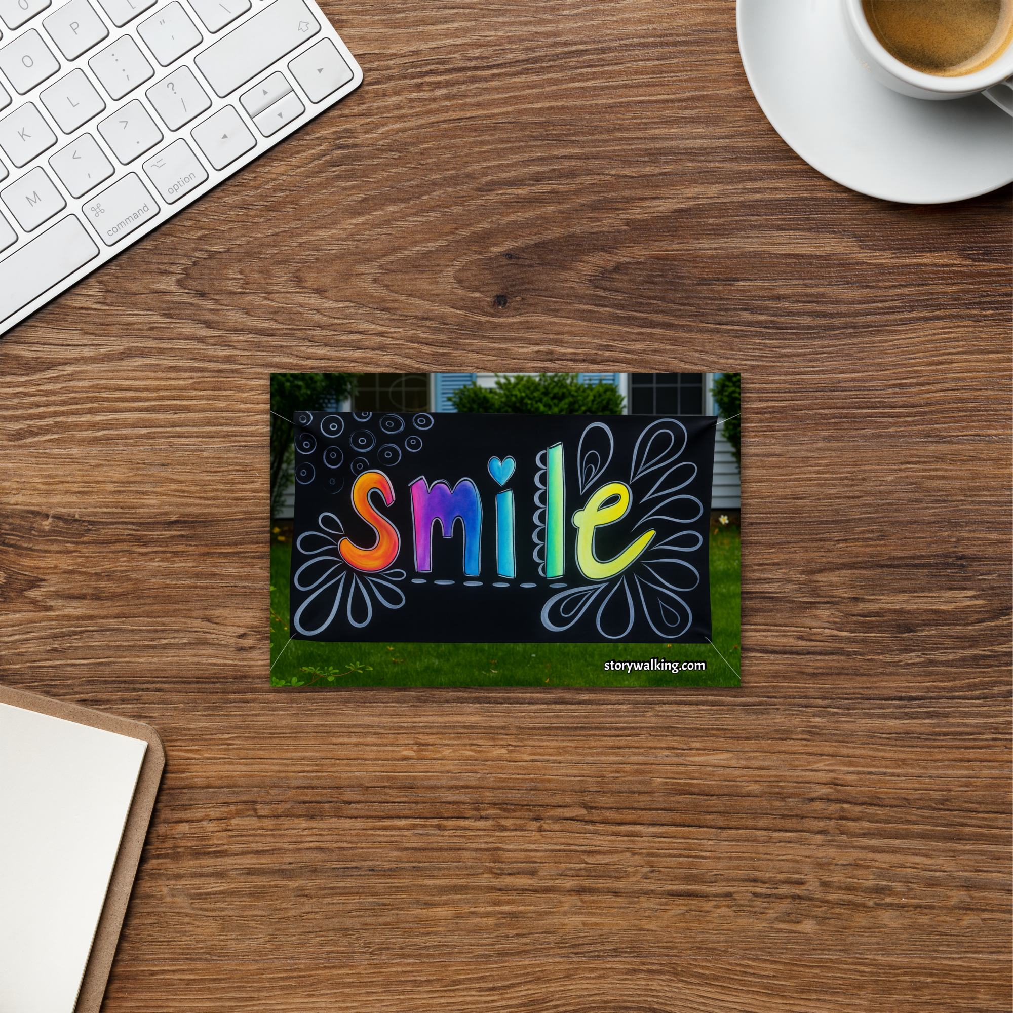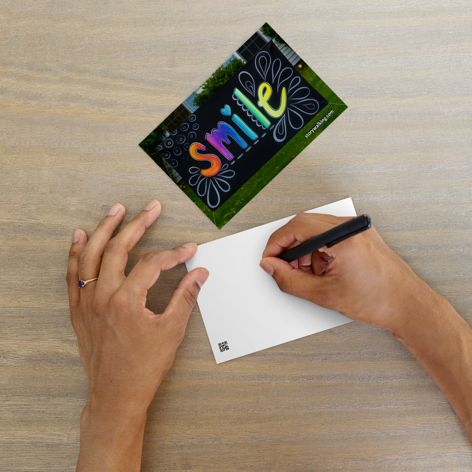 This vibrant postcard features the cheerful word “Smile” in rainbow-colored chalk art, surrounded by playful doodles. The bright colors and positive message serve as a reminder to embrace joy and spread positivity, no matter the day.