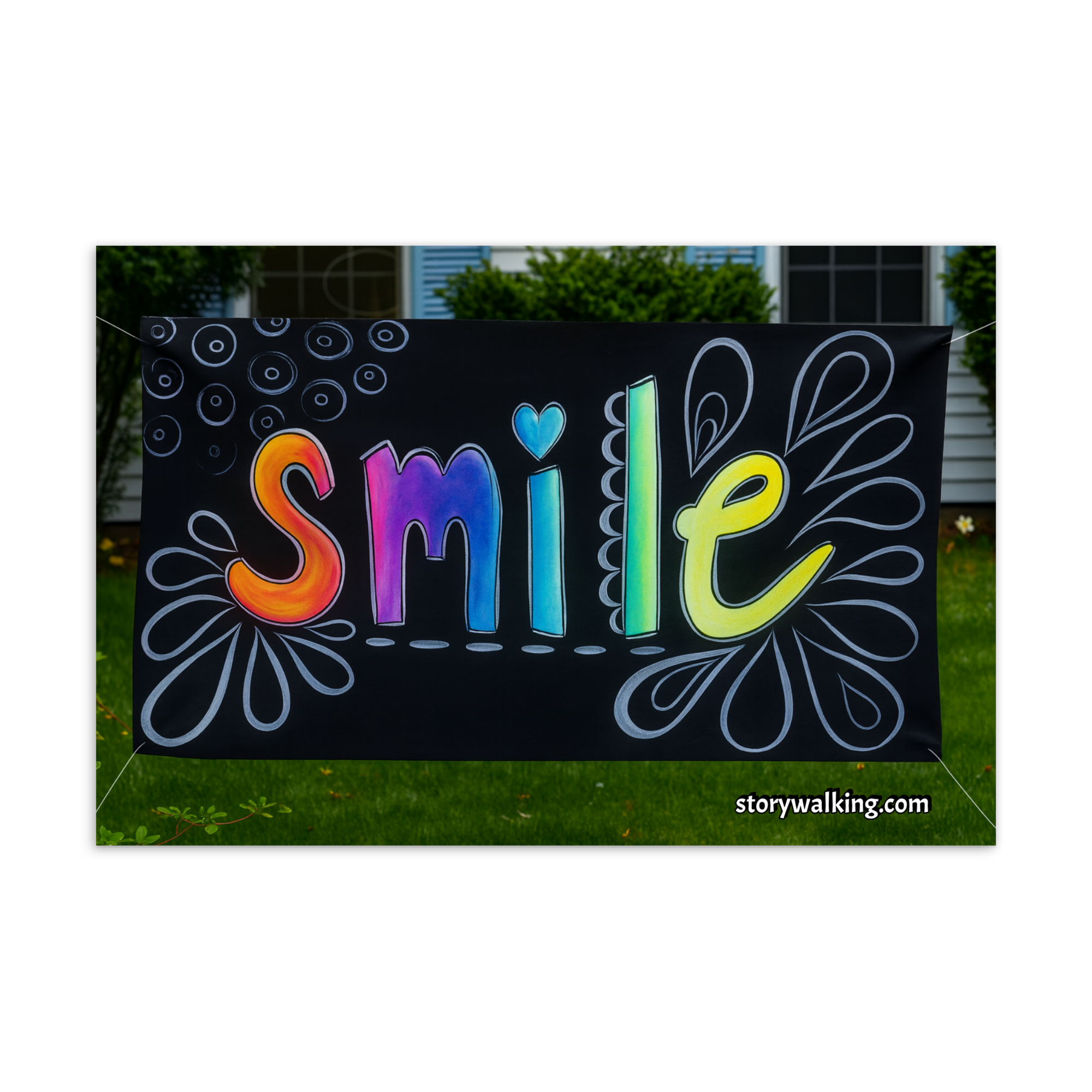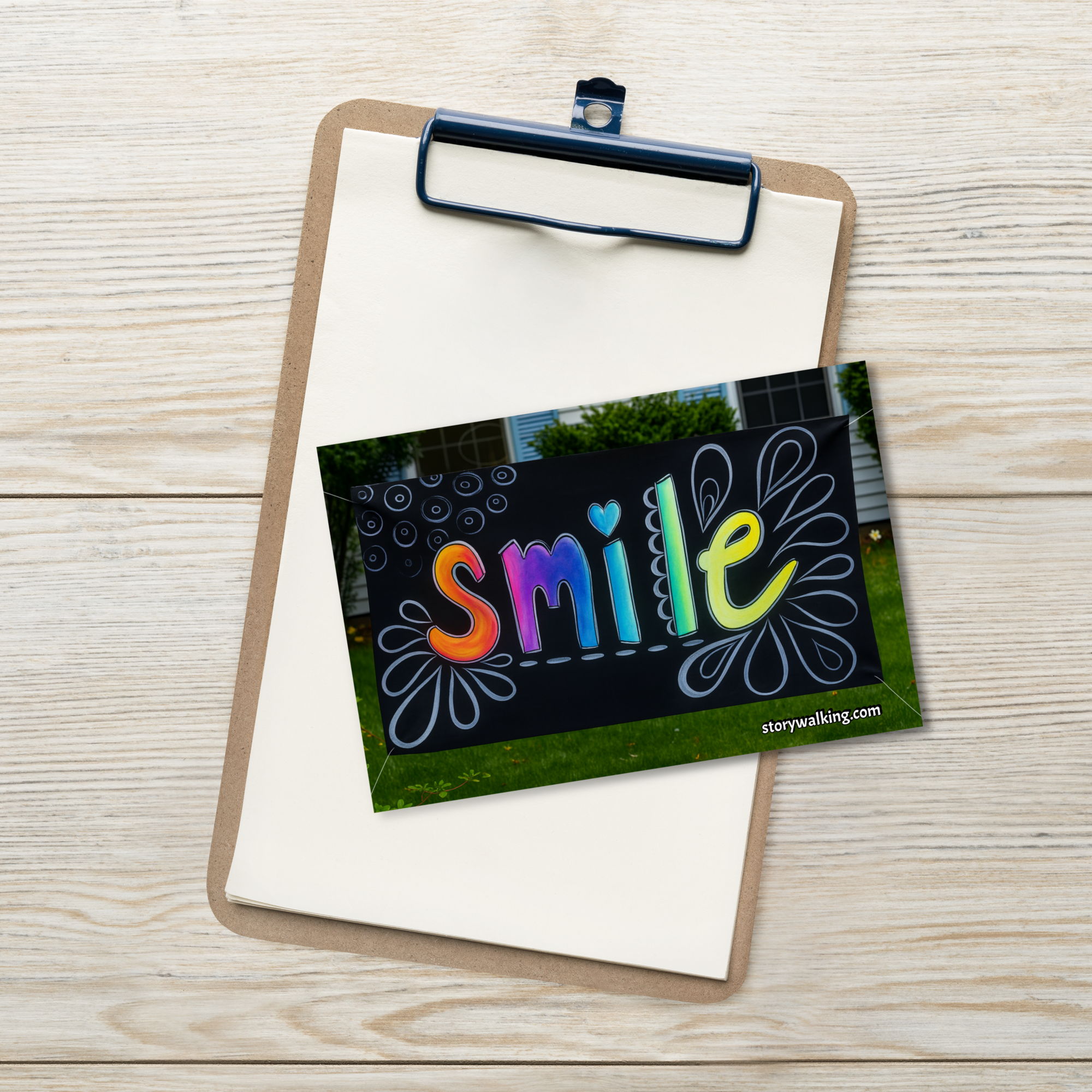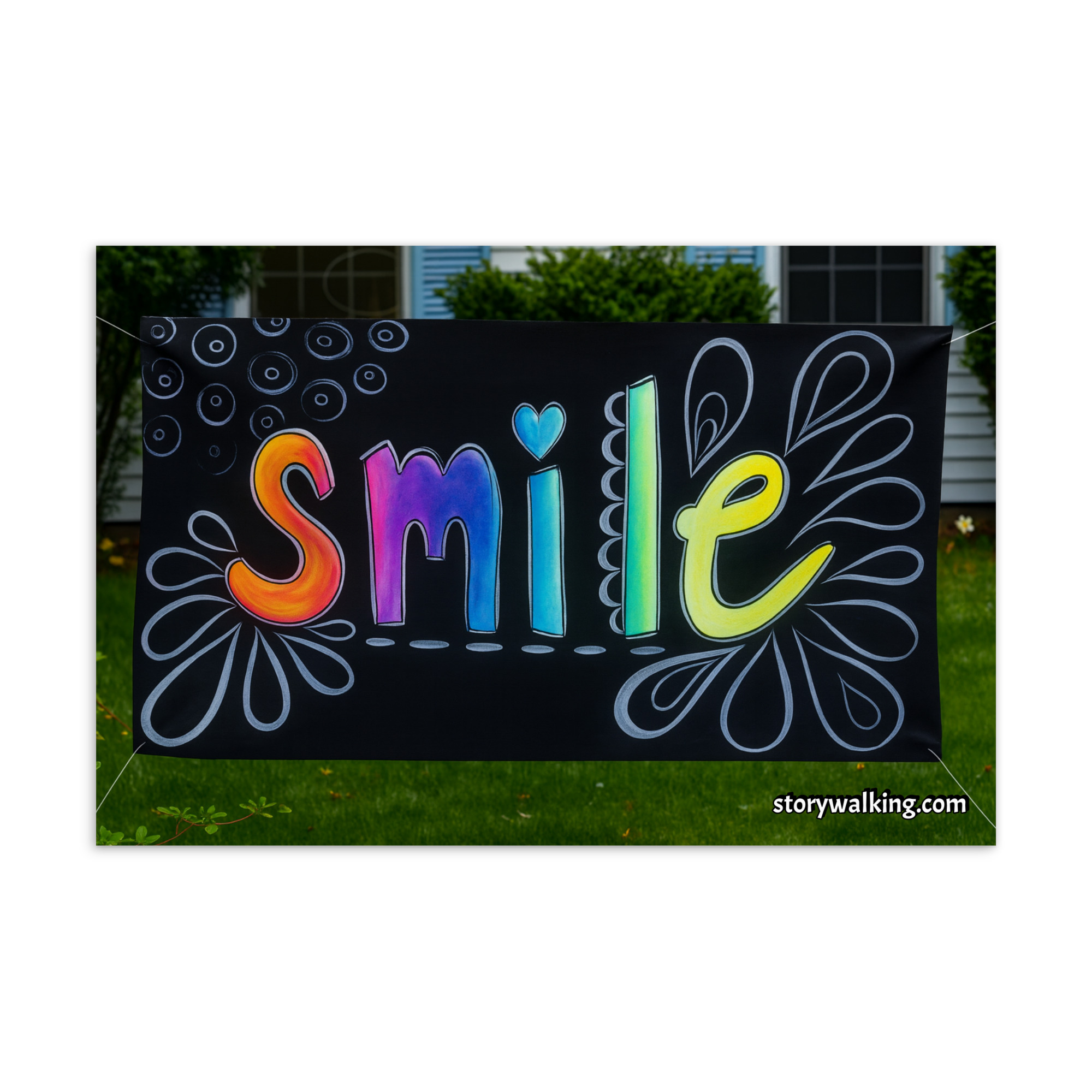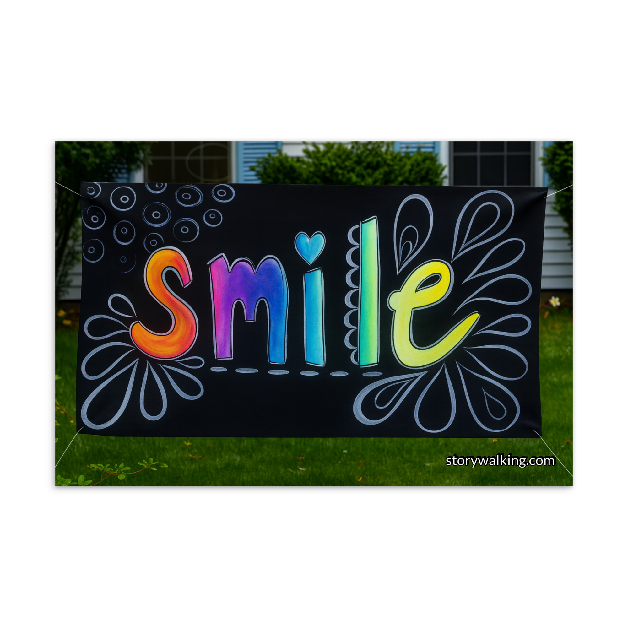 This vibrant postcard features the cheerful word “Smile” in rainbow-colored chalk art, surrounded by playful doodles. The bright colors and positive message serve as a reminder to embrace joy and spread positivity, no matter the day.