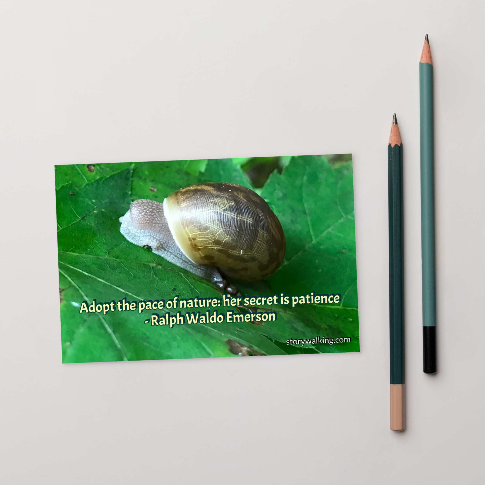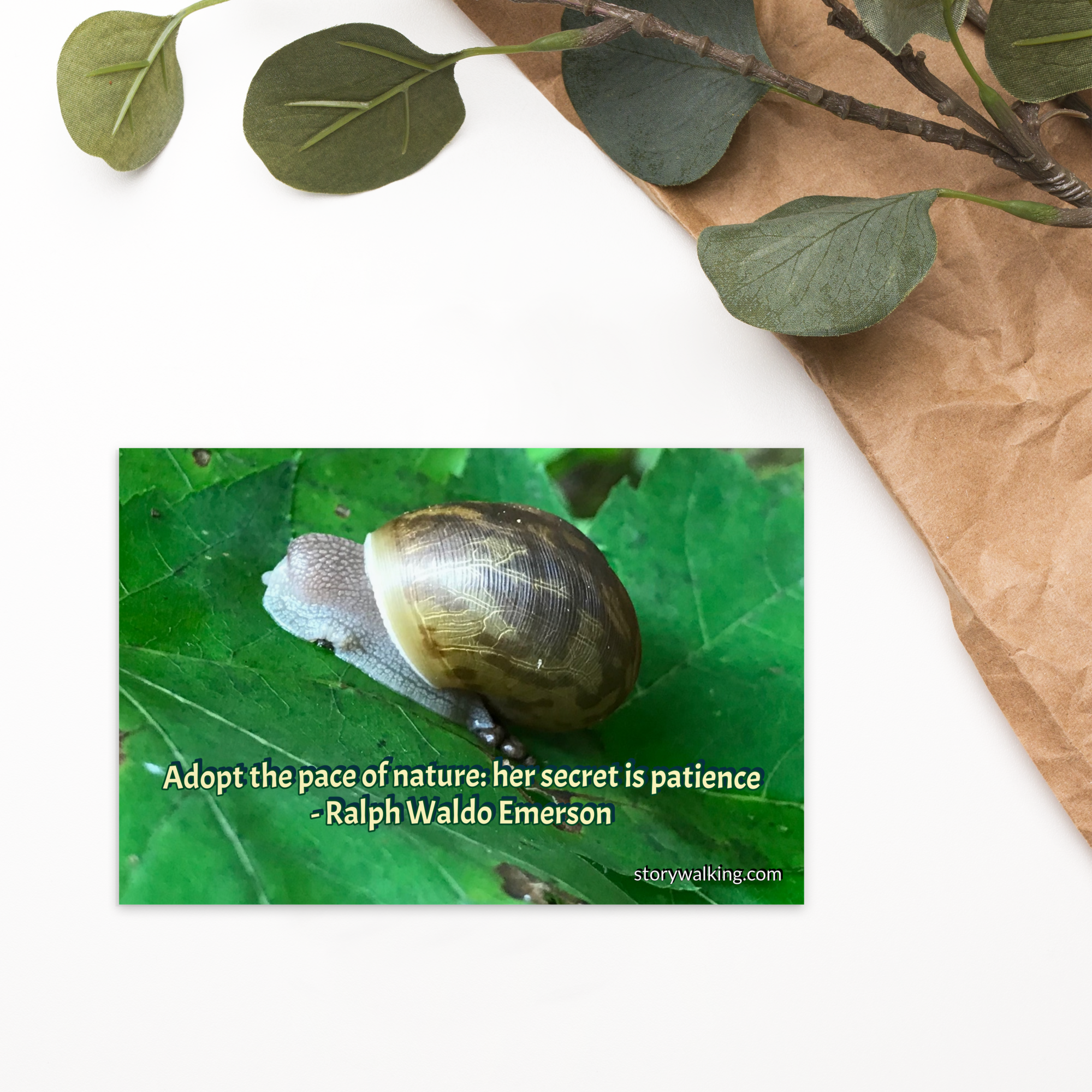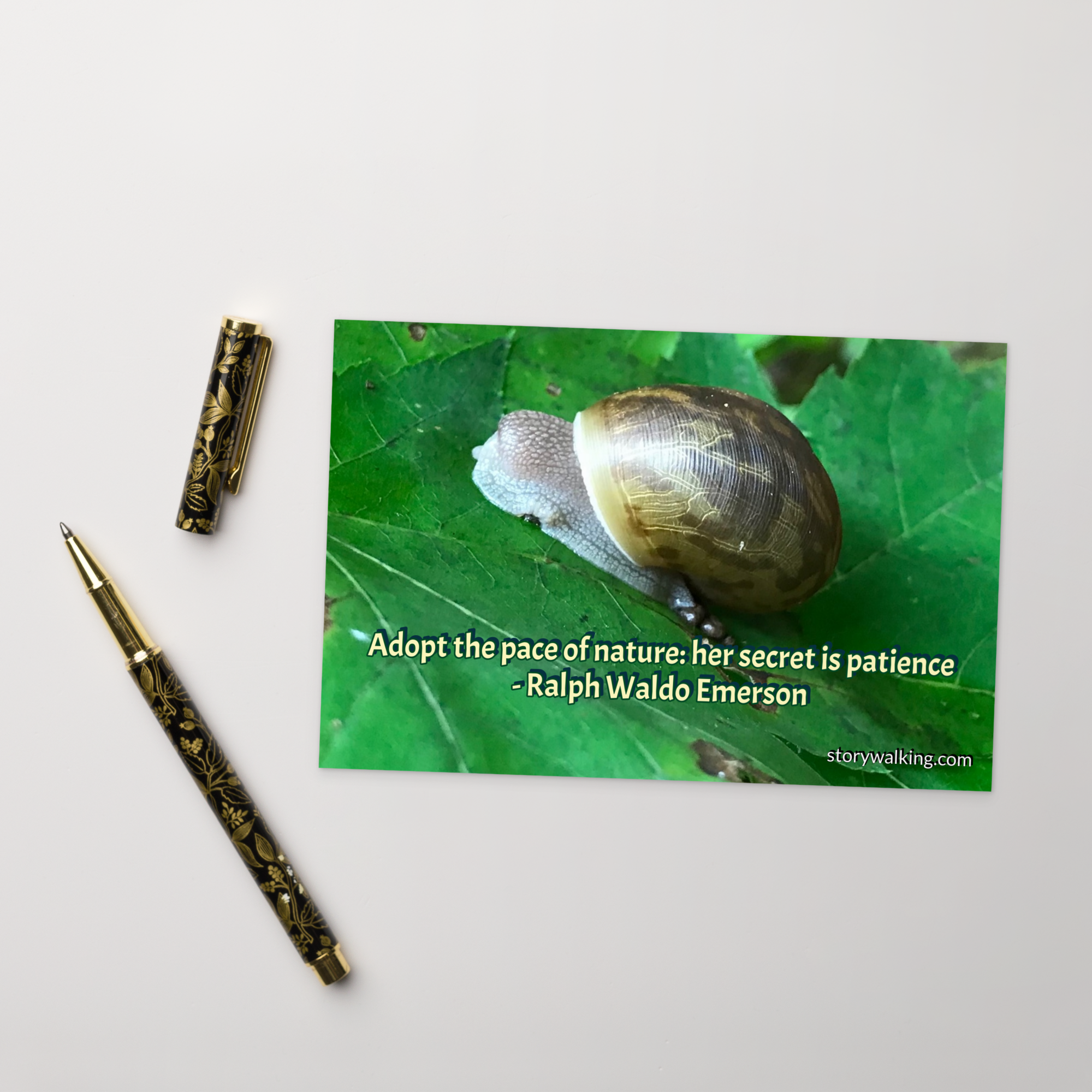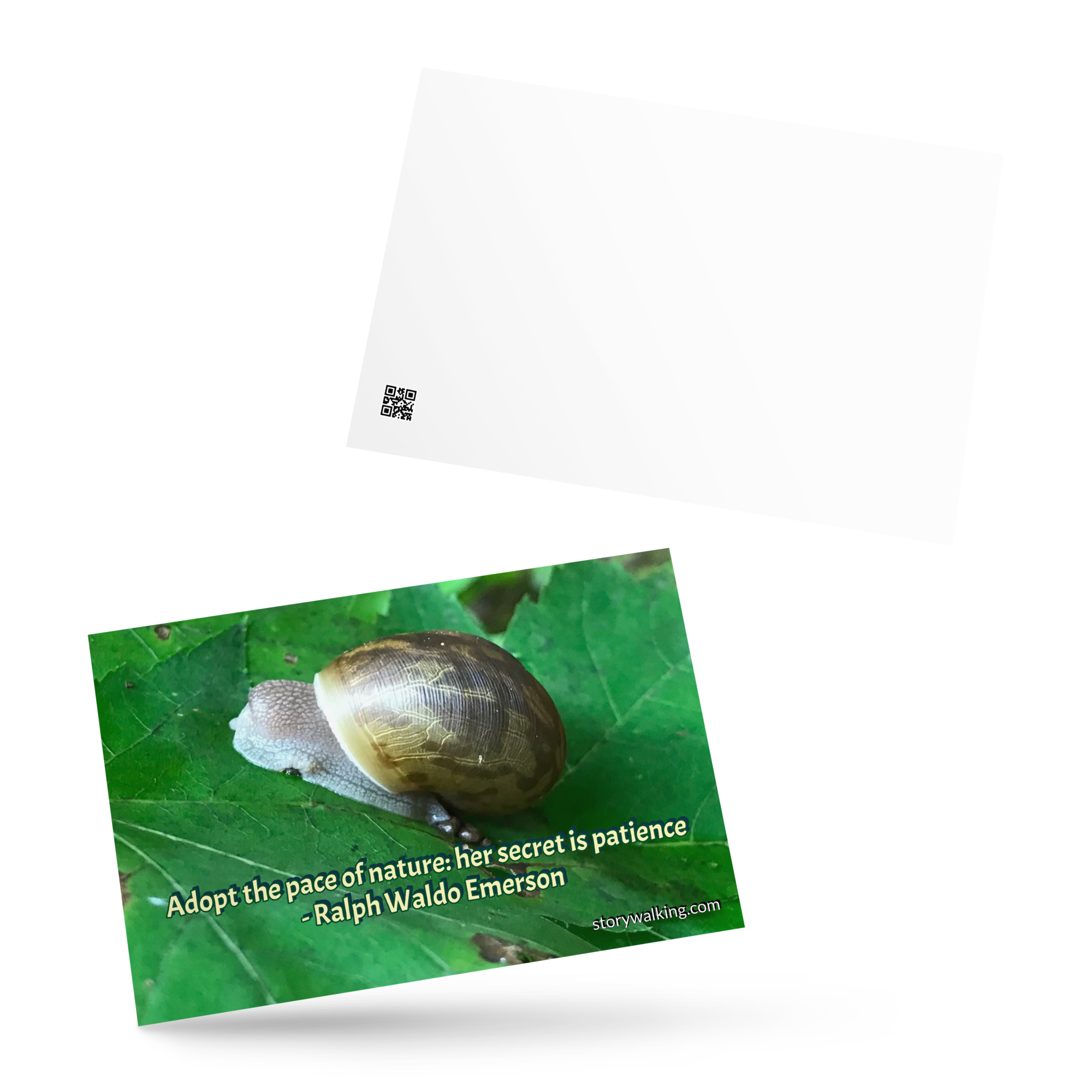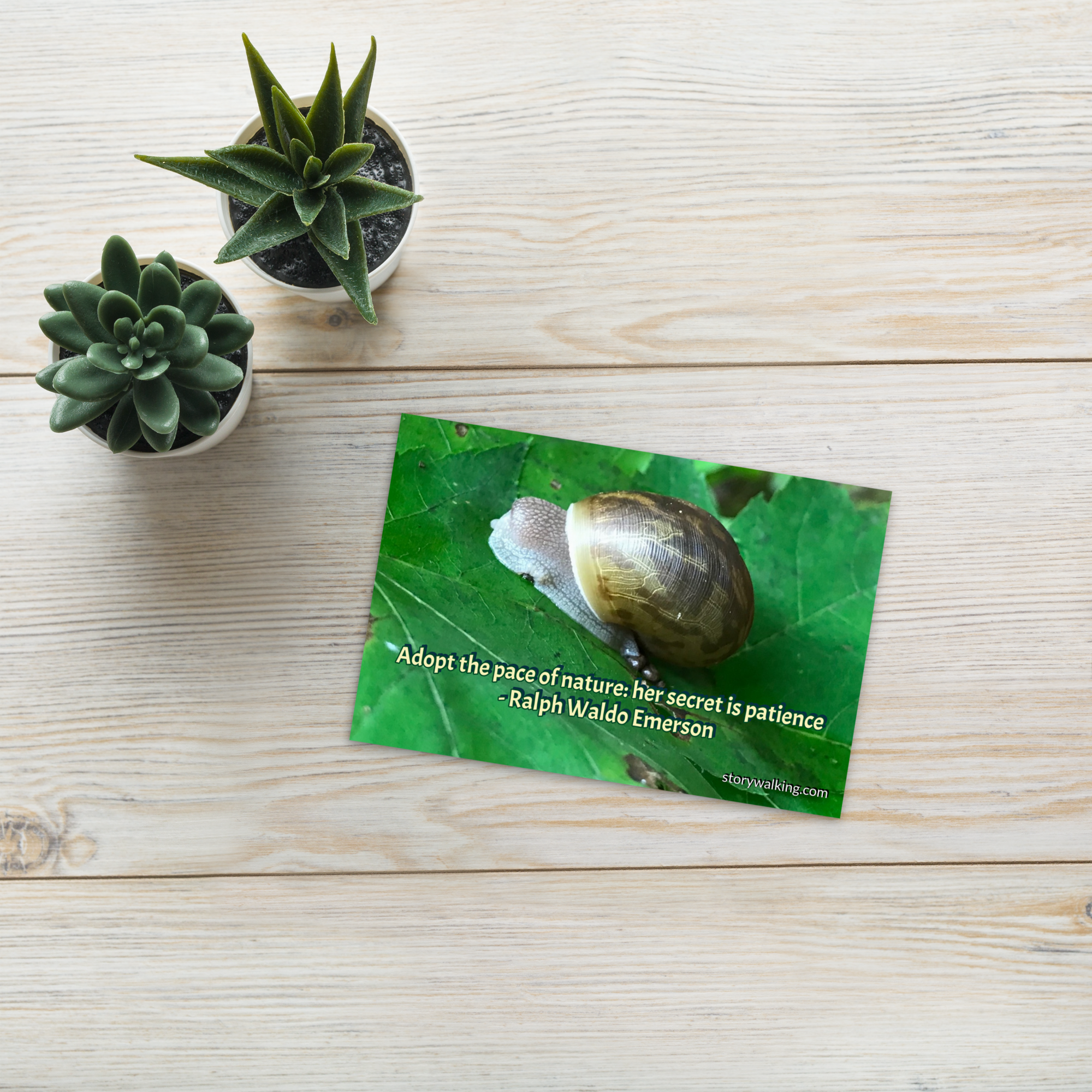 This serene and inspiring postcard features a beautiful image of a snail, symbolizing the slow, steady pace of nature. Paired with a quote from Ralph Waldo Emerson, “Adopt the pace of nature: her secret is patience,” it encourages reflection and mindfulness in the rush of everyday life.