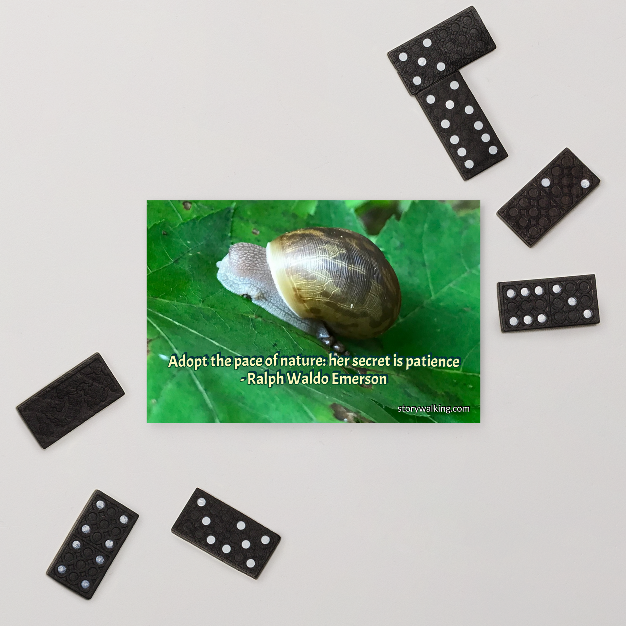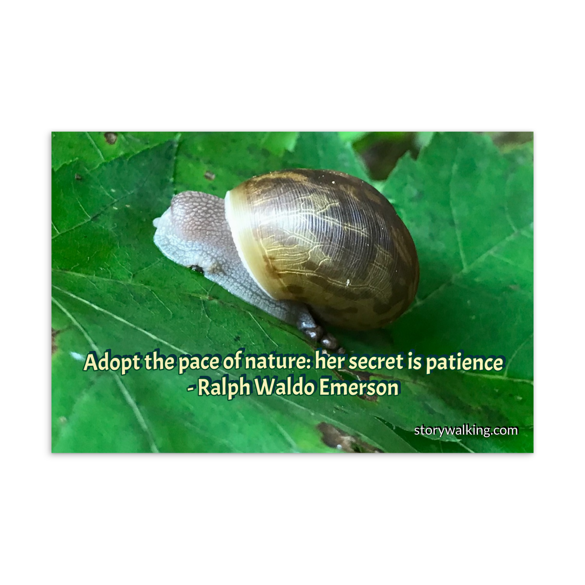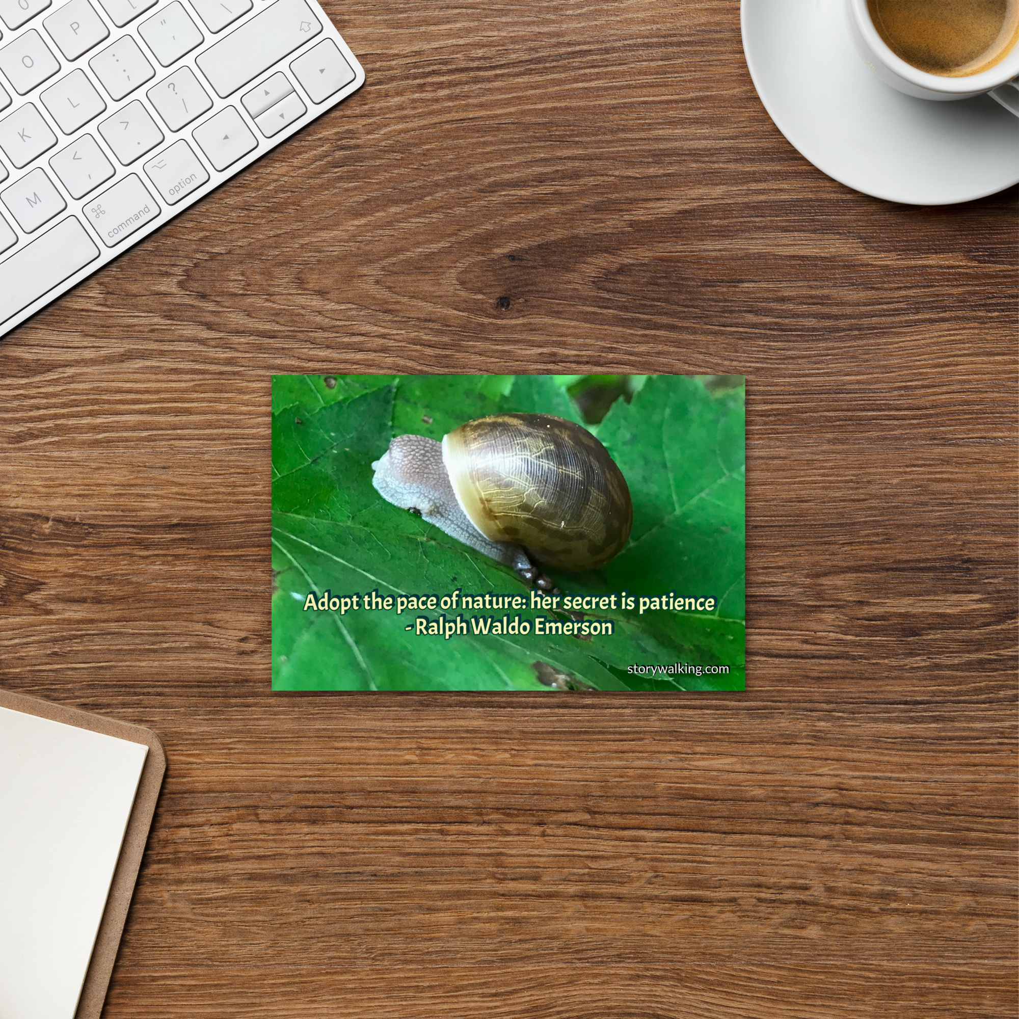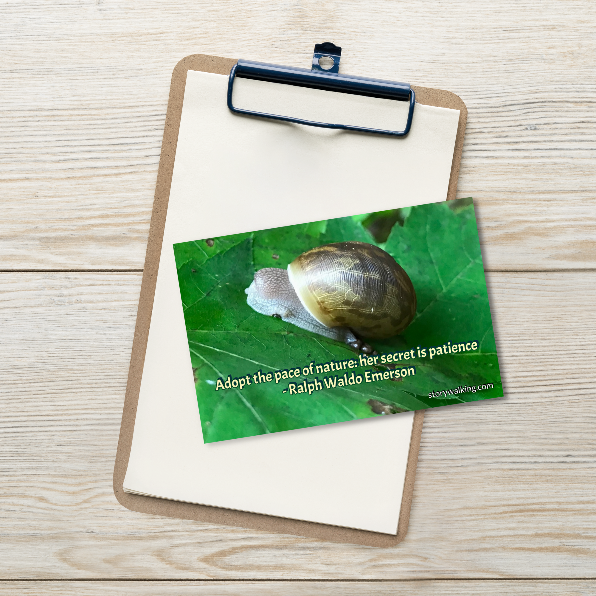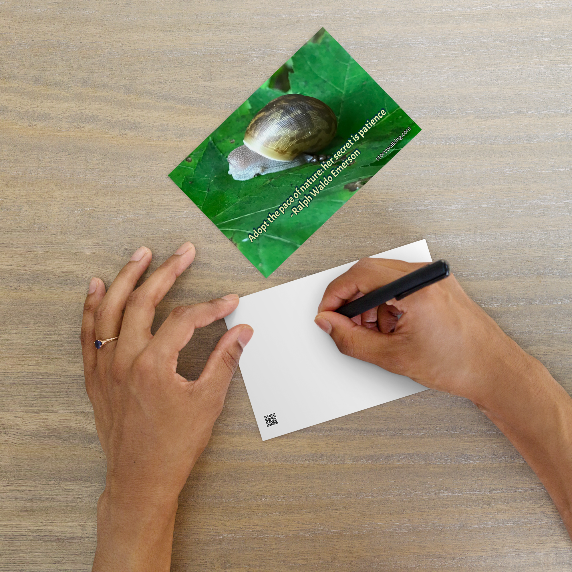 This serene and inspiring postcard features a beautiful image of a snail, symbolizing the slow, steady pace of nature. Paired with a quote from Ralph Waldo Emerson, “Adopt the pace of nature: her secret is patience,” it encourages reflection and mindfulness in the rush of everyday life.